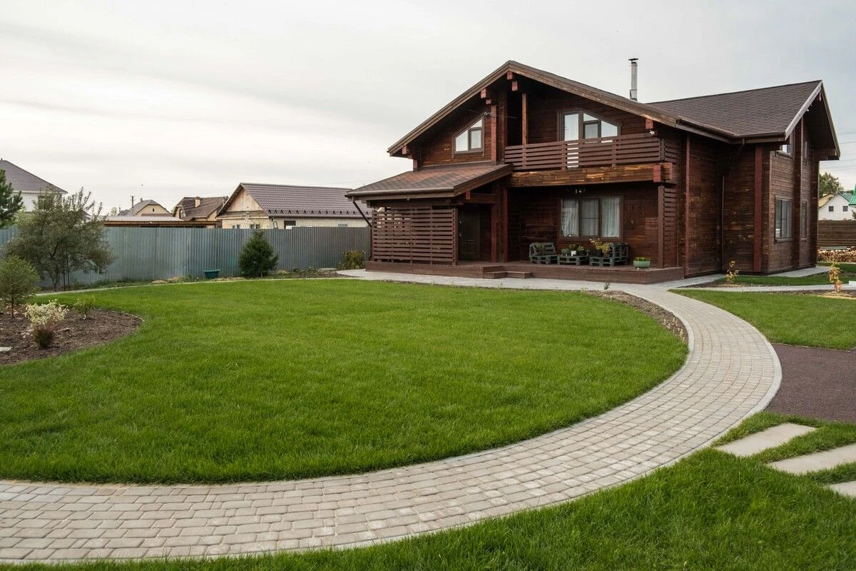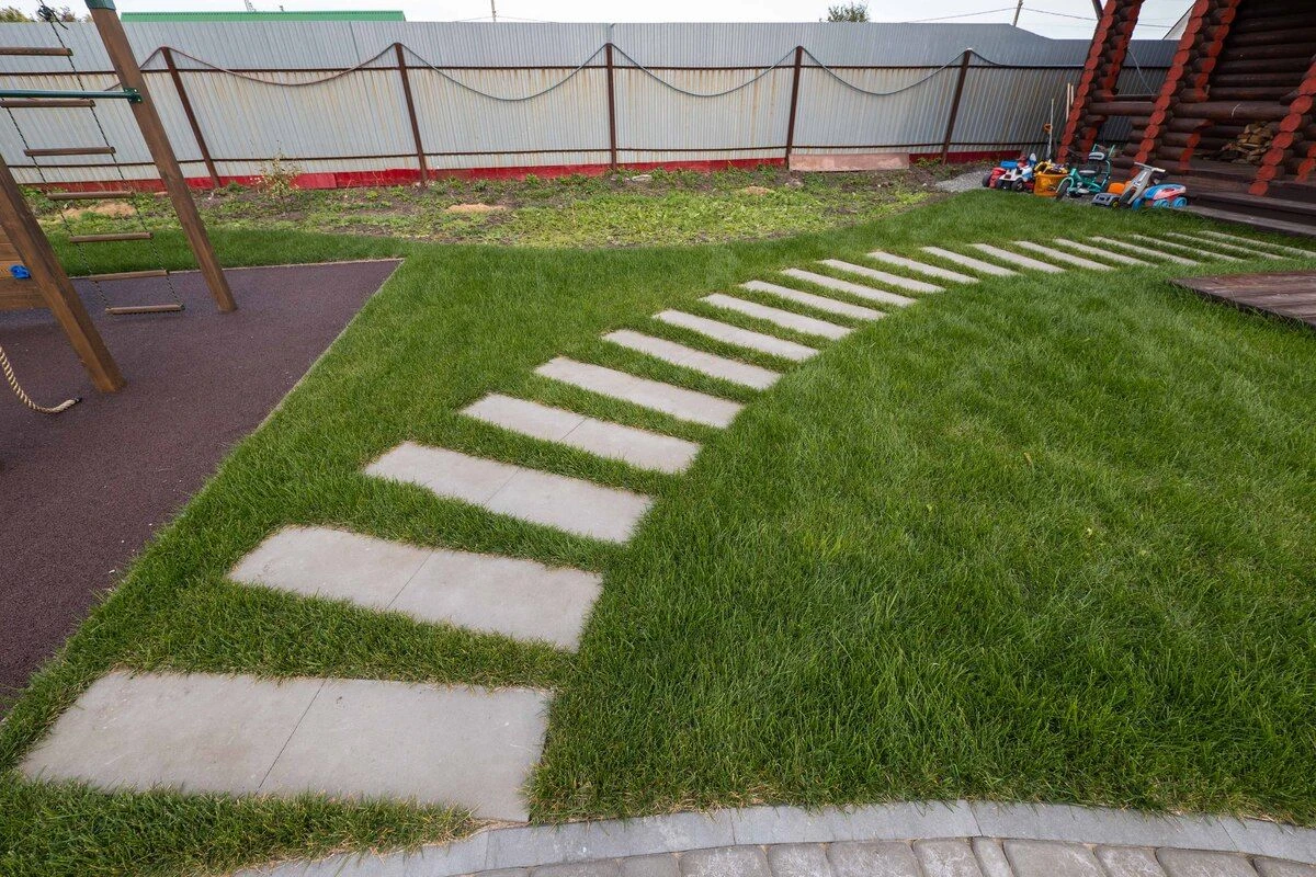Для пошаговых дорожек выбрана плитка Ла-линия (прямоугольник) 600х300х80 мм по 2 штуки в ряд. Стандарт, цвет белый.