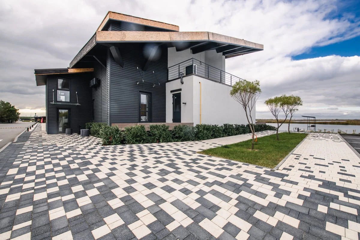 Основной рисунок выстроен с помощью хаотичной разбивки черного и белого цвета, но в местах ближе к дороге или дому плитка переходит в один цвет — черный или белый. Это визуально отделяет прогулочную зону от всех остальных, при этом подобранные цвета гармонируют с постройкой.