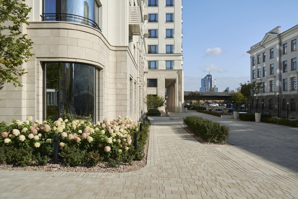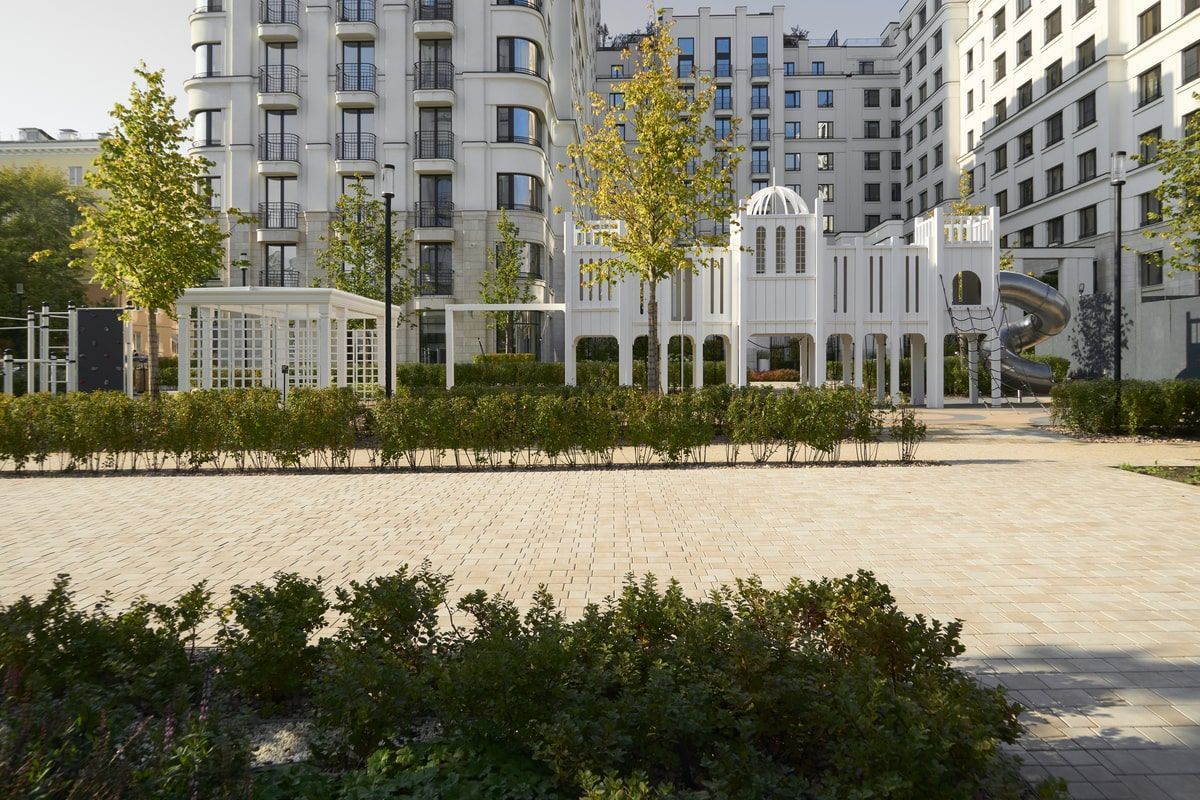 Для благоустройства территории жилого комплекса "На Некрасова" была выбрана плита формы Старый город, в цвете Степняк. А на окантовку Квадрат 100х100 мм. Песчаный цвет идеально сочетается с фасадами домов.
